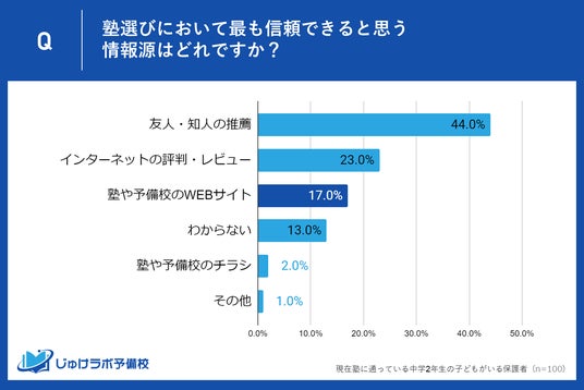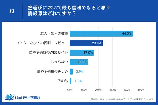 現在通塾している中学2年生の保護者を対象に「塾選びにおいて最も信頼できると思う情報源」に関するアンケート調査を実施しました。調査結果によると、44%の保護者が「友人・知人の推薦」を最も信頼できる情報源として選んでいることが明らかになりました。さらに、インターネットの評判やレビューも多くの保護者に支持されていることが示されました。