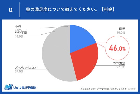 料金に対しては、19%が「満足」、27%が「やや満足」と回答し、合計46%の保護者が一定の評価をしていますが、37%が「どちらでもない」と感じています。14%が「やや不満」、3%が「不満」と回答しており、満足していない中2の保護者が過半数以上いることから、コストパフォーマンスの改善が必要です。
