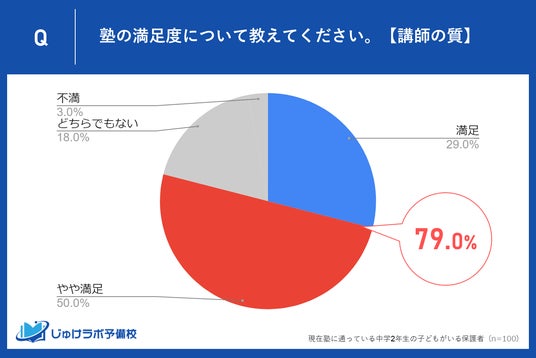 調査結果によると、29%の保護者が「満足」、50%が「やや満足」と回答し、合計79%が講師の質に対して高い満足度を示しました。質の高い講師陣が、保護者の信頼を得ていることがうかがえます。講師の質が高いことは、子供の学習効果に直結するため、多くの保護者が重要視しているポイントです。