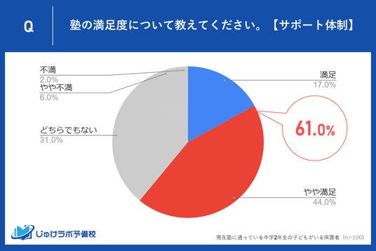 サポート体制については、17%が「満足」、44%が「やや満足」と回答し、合計61%の保護者が評価しています。保護者とのコミュニケーションや子供の学習サポートが充実していることがうかがえます。