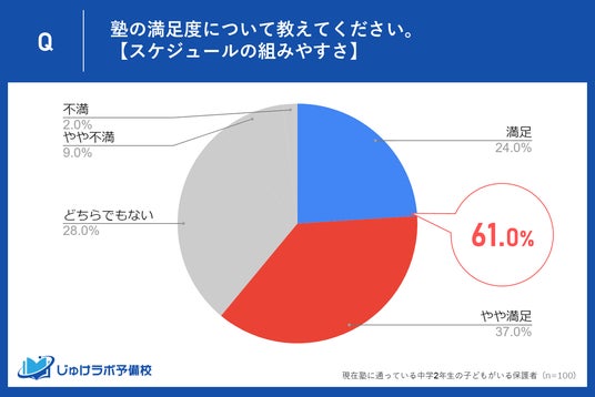 スケジュールの組みやすさについては、24%が「満足」、37%が「やや満足」と回答し、合計61%が評価しています。保護者が忙しい生活の中でも、子供の学習を効果的にサポートできる塾の取り組みが支持されていることがわかります。