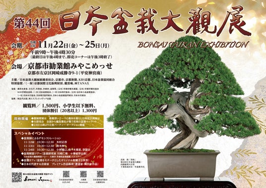 日本盆栽協同組合(所在地:東京都台東区)は、日本盆栽大観展組織委員会および京都市、京都新聞、KBS京都の共催で、2024年11月22日(金)から11月25日(月)に、京都市勧業館みやこめっせ(京都市左京区岡崎)にて「第44回日本盆栽大観展 BONSAI JAPAN」を開催します。