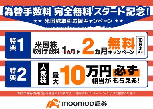 さらに、moomoo証券では米国株の取引手数料も他社の約1/4(※2)と非常に低コストであり、「ウェルカムプログラム」や「米国株取引応援キャンペーン」(8月6日開始)のキャンペーン特典を併用した場合、最初の2カ月は取引手数料も無料になり、「完全無料」(※3)で米国株投資を始めることが可能となります。