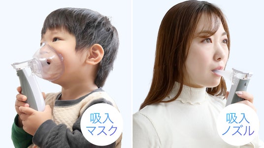 吸入マスクと吸入ノズルの2種類付属:小さなお子さまも使いやすいマスクタイプと、閉塞感が少ないノズルタイプ。どちらの吸入方法も可能です。