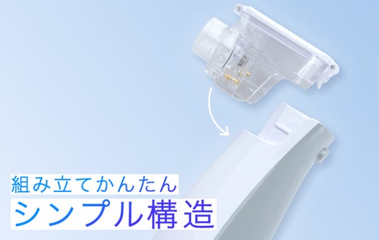 シンプル構造:使用後の洗浄は、薬液カップと吸入ノズル(マスク)の2つだけ。お手入れも取り付けも手間なくかんたんです。