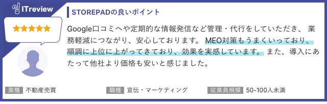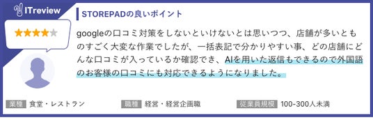 ITreviewには、「STOREPAD(ストアパッド)」をご活用いただいている飲食店や不動産仲介業者などの店舗事業者様から、嬉しいお声を多くいただきました。