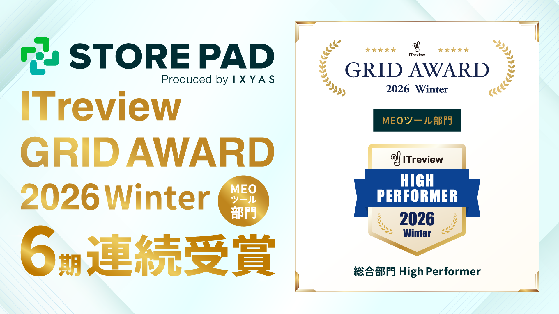 イクシアス株式会社(東京都中央区銀座、代表取締役社長 CEO:内藤 崇司)が開発・提供する、店舗集客媒体対応効率化AI SaaS 「STOREPAD(ストアパッド)」は、アイティクラウド株式会社が運営する IT 製品・クラウドサービスのレビュープラットフォーム「ITreview」において、MEOツール部門の「High Performer」総合部門を 6期連続で受賞したことをお知らせします。