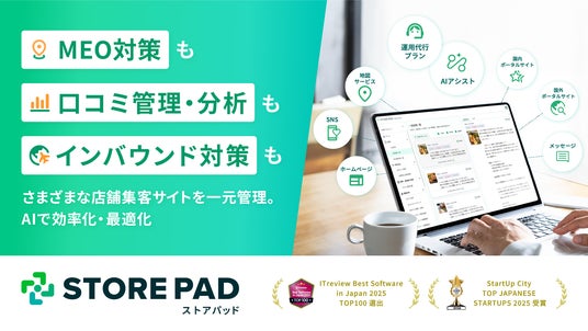 STOREPADは、国内外のさまざまな店舗集客メディアと連携する、店舗情報発信・分析プラットフォームです。地図アプリ・ポータルサイト・インバウンド向けメディア・SNS・HPなど様々な媒体への一括情報発信や口コミ分析で工数削減と集客向上、効果的なMEOを実現。店舗運営を成功に導きます。