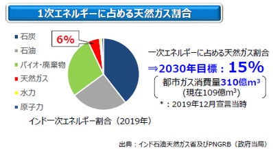 インド政府は積極的な再エネ導入政策を掲げており、「2030年までに非化石燃料による発電容量500GWを目指すこと、2030年までにエネルギー需要の50%を再エネで賄うこと、2070年までにカーボンニュートラルを目指すこと」を宣言しています。同時に、2030年までに一次エネルギー消費における天然ガスの比率を現在の6%から15%に引き上げる目標を設定し、政府主導でインド全土における事業権の入札を通じた都市ガスの普及促進も進めています。