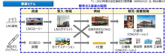 大阪ガスは、事業エリア内で都市ガスの調達、貯蔵、供給、販売までを一貫して行う事業モデルを構築しています。交通用を中心に、工業用、家庭用、業務用の需要に対して、パイプラインとLNG・CNGローリーを組み合わせてガス供給を行っています。インフラ整備と需要開発を進め、2030年に当社国内ガス販売量*1の半分超の規模(約35億m3)への拡大を目指しています。