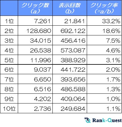 https://rank-quest.jp/column/column/how-to-seo/ 【SEO対策】で検索順位No.1を獲得した(注1)ランクエストが1~10位の検索順位毎のクリック率を解説