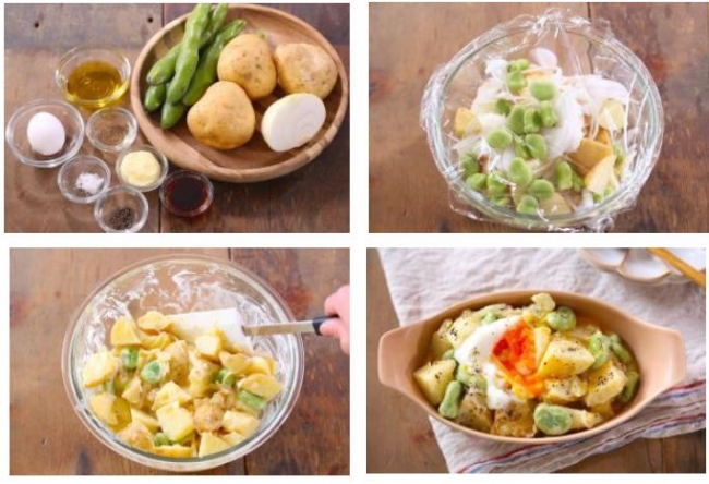 ・新じゃがと新玉ねぎ、空豆のホットポテサラ 温玉のっけ