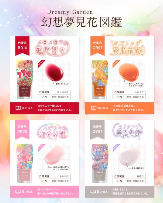 今回のテーマは、不思議な楽園で育まれる夢を咲かせる花々をモチーフにした「幻想夢見花(Dreamy Garden)」です。「恋心甘々(メロメロウ)」「贅沢貴族(マブリッチ)」「虹色幸運(ハピラキ)」「美麗心酔(クラクラリ)」といった少し謎めいた名前を持つ全4色をラインアップ。多幸感あふれる色彩や繊細なラメのきらめきにより、私たちの日常を指先からハッピーに彩ります。