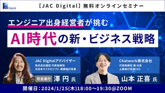 世界11ヵ国で人材紹介事業を展開する業界大手の株式会社 ジェイ エイ シー リクルートメント(代表取締役社長:田崎 ひろみ、本社:東京都千代田区)は、『エンジニア出身経営者が挑む、AI時代の新・ビジネス戦略』と題したオンラインセミナーを1/25(木)に開催いたします。