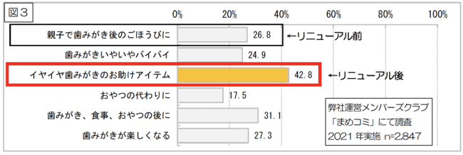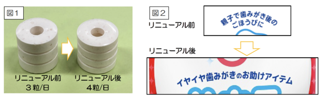 (2)これまでの1日3粒の価格で1日4粒お召しあがりいただけます。毎食後とおやつの後にもオーラルケアの機会を増やすことを提案いたします(図1)(※)。