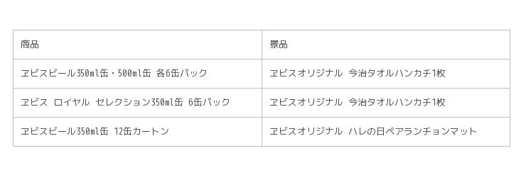 また、父の日に向けて「ヱビスオリジナル 今治タオルハンカチ」が付いた6缶パック、「ヱビスオリジナル ハレの日ペアランチョンマット」が付いた12缶カートンも6月2日より販売を開始し、“ハレの日”の一つ「父の日」を祝うにふさわしいビール、ヱビスをさらに訴求していきます。
