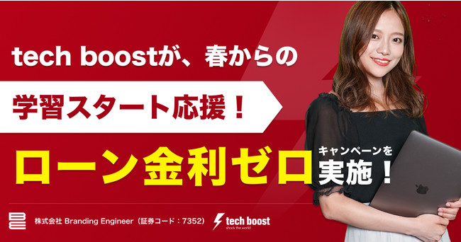 株式会社Branding Engineer(所在地:東京都渋谷区、代表取締役CEO:河端保志、代表取締役COO:高原克弥、証券コード:7352、以下Branding Engineer)は、運営するプログラミングスクールtech boost(以下、tech boost)にて、2022年1月14日から2月20日までのご契約者様を対象に、ローンをご利用して入学いただく方向けに金利ゼロキャンペーンを実施することをお知らせいたします。