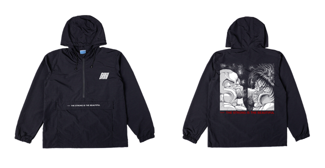 『グラップラー刃牙』最大トーナメント編の名シーンである、ジャックハンマー vs 刃牙の猛烈な殴り合いを落とし込んだアノラック。フラップ部分には、「THE STRONG IS THE BEAUTIFUL」の刺繍がストイックな印象です。