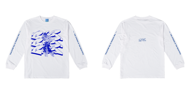 『刃牙』シリーズの中でも史実を基にした唯一のキャラクター、武蔵をプリントしたTシャツです。グラフィックにも厳かなニュアンスを持たせることで、アイテムとしての一体感を演出しています。