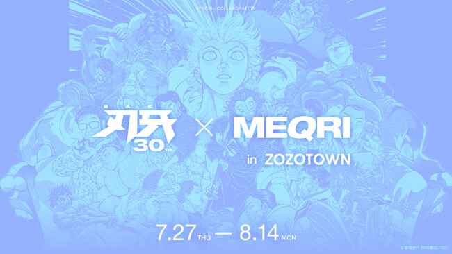 D2C支援事業やECプラットフォーム「ecforce」を提供する株式会社SUPER STUDIO(所在地:東京都目黒区、代表者:代表取締役 林 紘祐、以下:SUPER STUDIO)と、コンテンツIPに特化した事業創出会社である株式会社Helixes(所在地:台東区、代表者:代表取締役社長 志村龍之介)が運営するストリートアパレルブランド「MEQRI」(メクリ)は、大人気格闘漫画『刃牙』シリーズ(著:板垣恵介)のオリジナルアパレルの他、カルタやスケートボードデッキなどの雑貨類を含む計11アイテムを、2023年7月27日(木)より、日本最大級のファッションECサイト「ZOZOTOWN」にて期間限定で発売いたします。