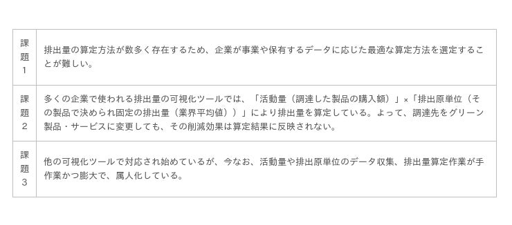 そして、今回提供開始する温室効果ガス排出量可視化プラットフォームは、このレベル2の到達に向けて以下の課題を解消するものです。