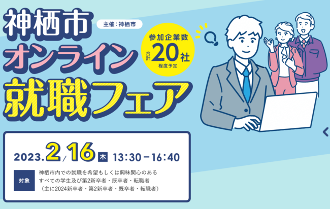 今回は、当社の人材支援サービスのプロダクトを活用して、茨城県神栖市が主催するオンライン就職フェアの集客を支援いたしました。本イベントは神栖市への就職を考えている学生及び第2新卒者、既卒者、転職者を対象に、茨城県神栖市の企業約20社と出会える就職フェアになっております。イベント開催前には、就職活動の専門家による特別就活応援セミナー動画の配信もしており、就職活動の対策強化も行うことが可能です。