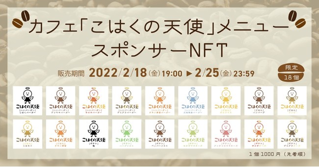 資本業務提携を締結した株式会社フォーイットとメディアエクイティ株式会社(本社:東京都品川区、代表取締役 椛島 誠一郎、以下「メディアエクイティ社」)は、コロナ禍で売上げが低迷する飲食店の支援を目的に、飲食店のメニューのスポンサー枠をNFTとして発行する飲食店応援プロジェクト「飲食店スポンサーNFT」を始動いたします。日頃利用している飲食店や応援したい飲食店のメニューのスポンサー枠を購入することで、メニュー毎にスポンサー権利が付与されます。プロジェクト第1弾は、徳島県にある水研ぎ焙煎コーヒーが自慢のカフェ「こはくの天使」の人気メニュー18種類のスポンサーNFTを2月18日(金)より販売いたします。