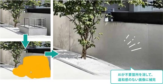 写真に写り込んだ不要なものは、範囲を選択するだけで簡単に削除ができます。外構リフォームを検討する際に、既存の構造物やアイテムなど、不要な要素を取り除くと同時に、AIが自動的に違和感のない背景を補完します。これにより自由度が高く、よりリアルなシミュレーションが可能になります。