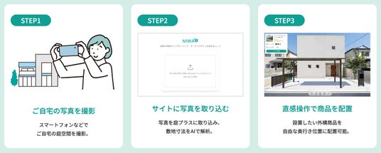 スマートフォンやカメラで撮影したご自宅などの外構写真を本サイトにアップロードすると、生成AIが写真から3D空間を自動で認識。登録されているフェンス、門扉、デッキ、照明、植栽などのガーデン・エクステリアアイテムを3D空間に自由に配置できるため、理想の外構デザインを簡単に作成することが可能です。