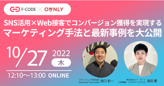 SNSマーケティングプラットフォーム「OWNLY」(オウンリー)を開発・運営するスマートシェア株式会社(東京都渋谷区、代表取締役 西山統、以下「当社」)は、株式会社エフ・コード(東京都新宿区、代表取締役社長 工藤 勉、以下エフ・コード)と2022年10月27日(木)にオンラインセミナーを開催いたします。