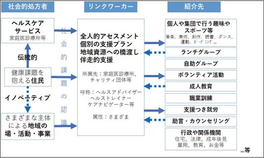 中でも、プラスケアの「暮らしの保健室」では様々な主体による地域の場・活動・事業の広がりを志向する”イノベーティブ”な社会的処方を得意とされています(上図の点線矢印)。
