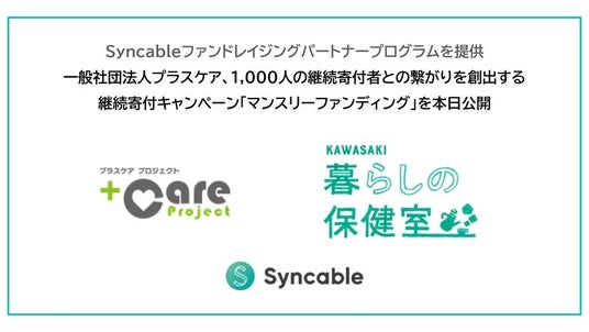新しい寄付の形を作り出すことで民間の社会保障を拡大する寄付決済プラットフォームSyncableを運営する株式会社STYZ(東京都渋谷区、代表取締役社長:田中 辰也)は、一般社団法人プラスケア(神奈川県中原区、代表理事:西 智弘)の資金調達活動である1000人の継続寄付者募集プロジェクトを支援します。
