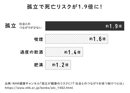 そして、喫煙、過度の飲酒、肥満などの生活習慣を上回るのが、孤独感を引き起こす「社会とのつながりが少ないこと」です。
