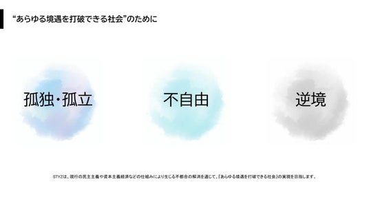 寄付プラットフォームSyncable運営企業であるSTYZは、こうした現行の仕組みにより生じる不都合の解消を通じて、孤独・孤立や不自由、逆境というような『あらゆる境遇を打破できる社会』の実現を目指します。