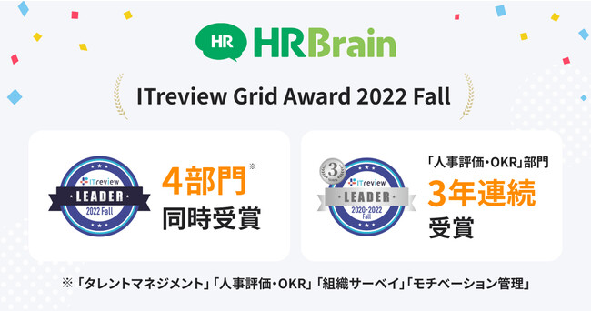 株式会社HRBrain(東京都品川区、代表取締役CEO:堀 浩輝、以下「当社」)が提供する、タレントマネジメントシステム「HRBrain」は、「ITreview Grid Award 2022 Fall」の4部門(「タレントマネジメント」「人事評価・OKR」「組織サーベイ」「モチベーション管理」)にてユーザー満足度と認知度の高い製品に贈られる称号「Leader」を受賞しました。