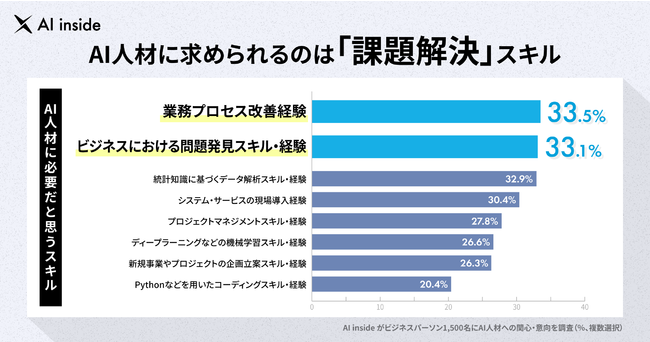 AI人材には、コーディングなどのスキル以上に、「業務プロセス改善」や「問題発見解決」などビジネスの課題解決に関するスキルが求められている