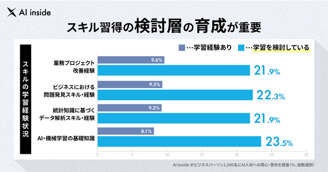 AI人材に求めるスキルの習得・学習経験についての設問(※8)では、上位3つのスキル「業務プロセス改善経験」(9.6%)「ビジネスにおける問題発見解決スキル・経験」(9.3%)「統計知識に基づくデータ解析スキル・経験」(9.2%)の学習経験者(現在学習している人も含む)はいずれも10%以下の結果となりました。一方、学習を検討している層はそれぞれ20%以上(※9)存在していることがわかりました。