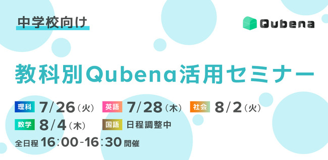 AI型教材「Qubena(キュビナ)」を開発・提供する株式会社COMPASS(本社:東京都文京区、代表取締役:小川正幹)は、全国の自治体・学校関係者向けに、中学校各教科の特徴や活用ポイント、また実践事例をご紹介するオンラインセミナー「教科別Qubena活用セミナー」を、実際にご利用頂いている学校の先生方をゲストに迎え、7月26日(火)より順次開催いたします。