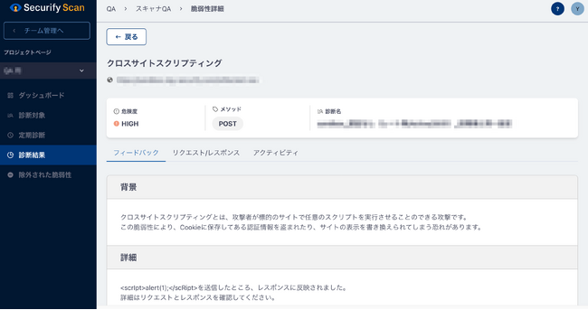 Securify Scan は、診断対象を登録するとクラウド上で脆弱性診断を実施、診断結果一覧と改善方法を分かりやすく提示するサービスです。開発、リリーススピードを落とさず、手軽に社内でセキュリティ診断を実施できるツールとして開発いたしました。