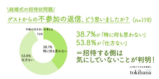 LINEでできる式場探し『トキハナ(https://tokihana.net/)』を運営する株式会社トキハナ(本社:東京都港区、代表取締役社長:安藤 正樹、以下 「トキハナ」)は、インターネットリサーチによる20~40代の654人を対象としたサンプリング調査の結果、結婚式の招待状を受け取り、不参加を選んだ131人のうち75.6%が「不参加を選ぶ際に気まずさを感じた」と回答しました。一方で、招待側として不参加の返信を受け取った119人では、38.7%が「特に何も感じない」、53.8%が「仕方ない」と回答しており、不参加の返信に対してそれほど気にしていないことが明らかになりました。