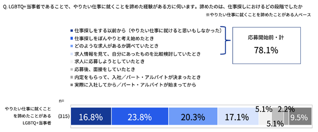 LGBTQ+当事者であることで、仕事に就くことを諦めた経験のある人のうち、約8割(78.1%)が仕事に応募する前に諦めたと回答しました。