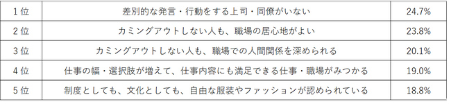 LGBTQ+当事者がやりたい仕事を諦めないために、企業や職場に求めることを尋ねたところ、1位「差別的な発言・行動をする上司・同僚がいない」(24.7%)、2位「カミングアウトしない人も、職場の居心地がよい」(23.8%)、3位「カミングアウトしない人も、職場での人間関係を深められる」(20.1%)でした。