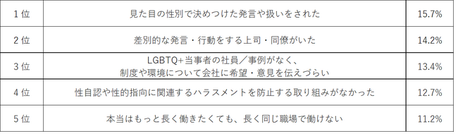 「LGBTQ+当事者であることで、やりたい仕事を続けることを諦めた理由」は、1位「見た目の性別決めつけた発言や扱いをされた」(15.7%)、2位「差別的な発言・行動をする上司・同僚がいた」(14.2%)、3位「LGBTQ+当事者の社員/事例がなく、制度や環境について会社に希望・意見を伝えづらい」(13.1%)という結果でした。