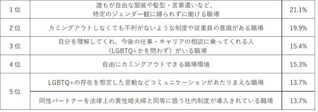 また、今よりもっと違和感や生きづらさを感じず安心して働くために、企業や職場に求めることを尋ねたところ、1位「誰もが自由な服装や髪型・言葉遣いなど、特定のジェンダー観に縛られずに働ける職場」(21.1%)、2位「カミングアウトしなくても不利がないような制度や従業員の意識がある職場」(19.9%)、3位「自分を理解してくれ、今後の仕事・キャリアの相談に乗ってくれる人(LGBTQ+かを問わず)がいる職場」(15.4%)でした。