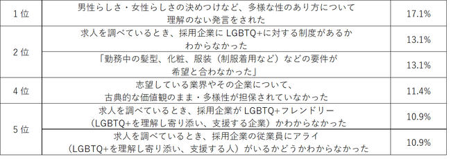 「LGBTQ+当事者であることで、やりたい仕事に就くことを諦めた理由」は1位が「男性らしさ・女性らしさの決めつけなど、多様な性のあり方について理解のない発言をされた」17.1%、次いで「求人を調べているとき、採用企業にLGBTQ+に対する制度があるかわからなかった」「勤務中の髪型、化粧、服装(制服着用など)などの要件が希望と合わなかった」が共に13.1%という結果でした。