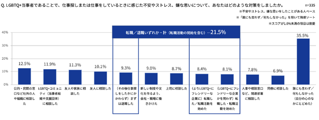 LGBTQ+当事者の3人に1人が「仕事探しや職場において、不安やストレス、嫌な思いを経験したことがある」。それに対し行ったことは、「誰にも言わず/何もしなかった」が35.5%。一方で5人に1人が「退職もしくは転職(活動の開始を含む)」を選択した経験がある