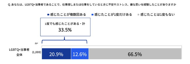 「LGBTQ+当事者であることがきっかけで、仕事探しや職場において不安やストレス、嫌な思いをした経験」について尋ねたところ、3人に1人以上(33.5%)が経験したことがあると回答しました。