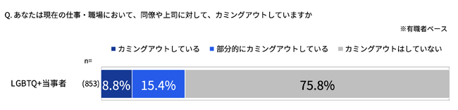 現在の職場において、同僚や上司に対してカミングアウト(自身の性自認や性的指向を誰かに打ち明けること)をしているかを尋ねたところ、LGBTQ+当事者の7割以上(75.8%)が「カミングアウトをしていない」と回答しました。