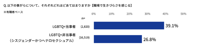 「職場で生きづらさを感じる」LGBTQ+当事者が約4割(39.1%)。非当事者(26.8%)の約1.5倍