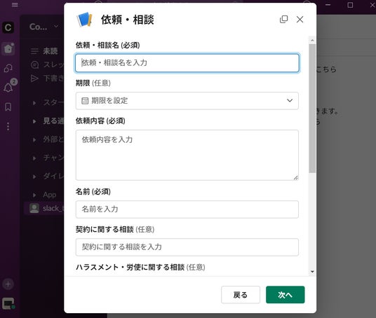 この機能を活用すれば、事業部は「ContractS CLM」にログインせず、普段使用しているSlack上で相談を受けることができます。